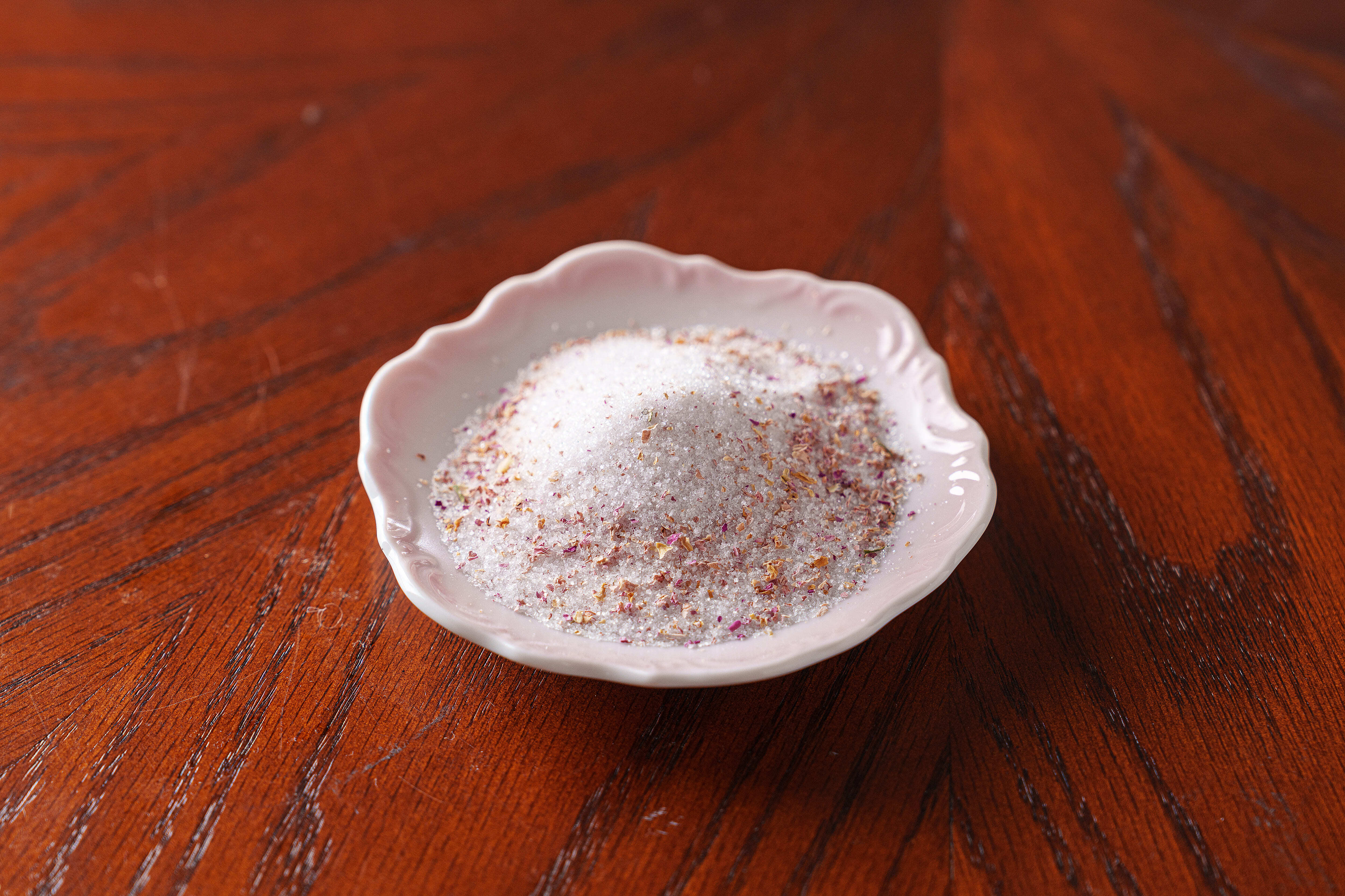 淡いピンクのダマスクローズの花びらをふんだんに使った贅沢なお砂糖です。
